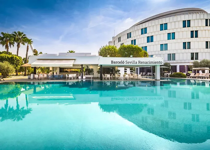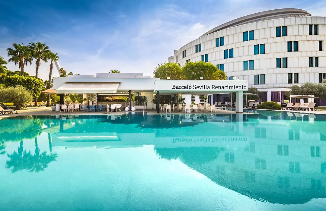 Barcelo Sevilla Renacimiento is a 5-star hotel recognized for its distinctive architecture inspired by the Guggenheim Museum. This family-friendly accommodation features extensive leisure facilities, including a heated pool and direct access to the Isla Mágica theme park.
