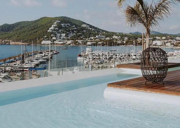 The hotel features comprehensive business facilities including eight meeting rooms and a large hall with panoramic views. Transportation options consist of taxis from the nearby airport or harbor access at Santa Eulalia's marina.