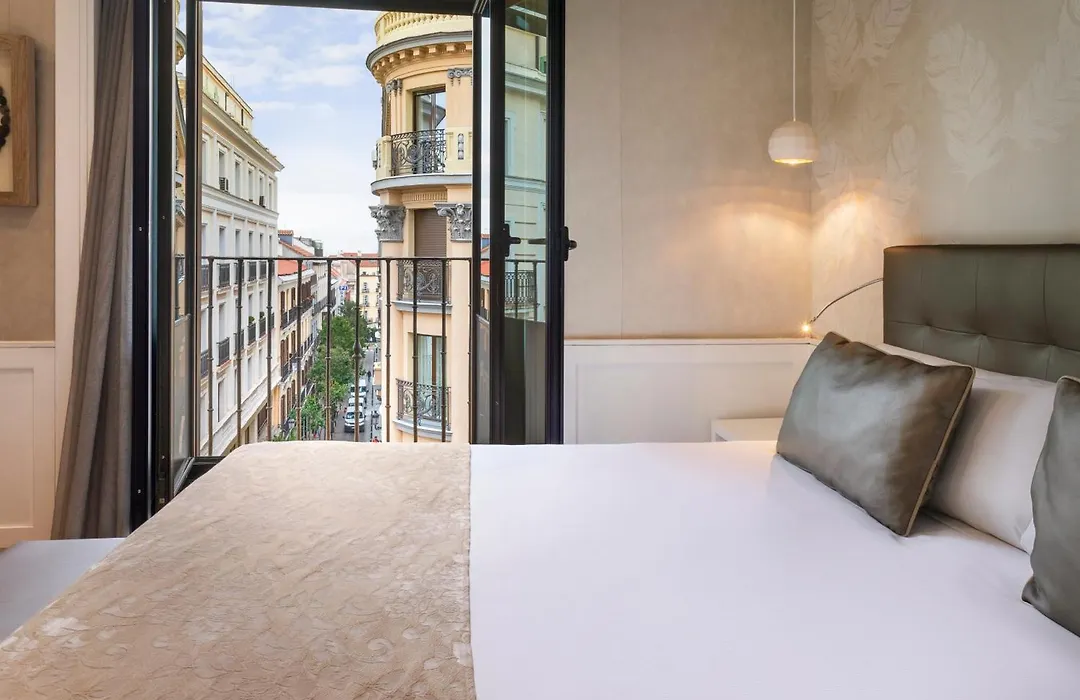 Rooms at Catalonia Puerta Del Sol feature contemporary designs with amenities such as flat-screen TVs, minibars, and Nespresso machines. Family rooms are available, accommodating up to four guests with twin beds and bunk beds for children. The ambiance is complemented by an interior courtyard typical of the period, enhancing the guest experience.