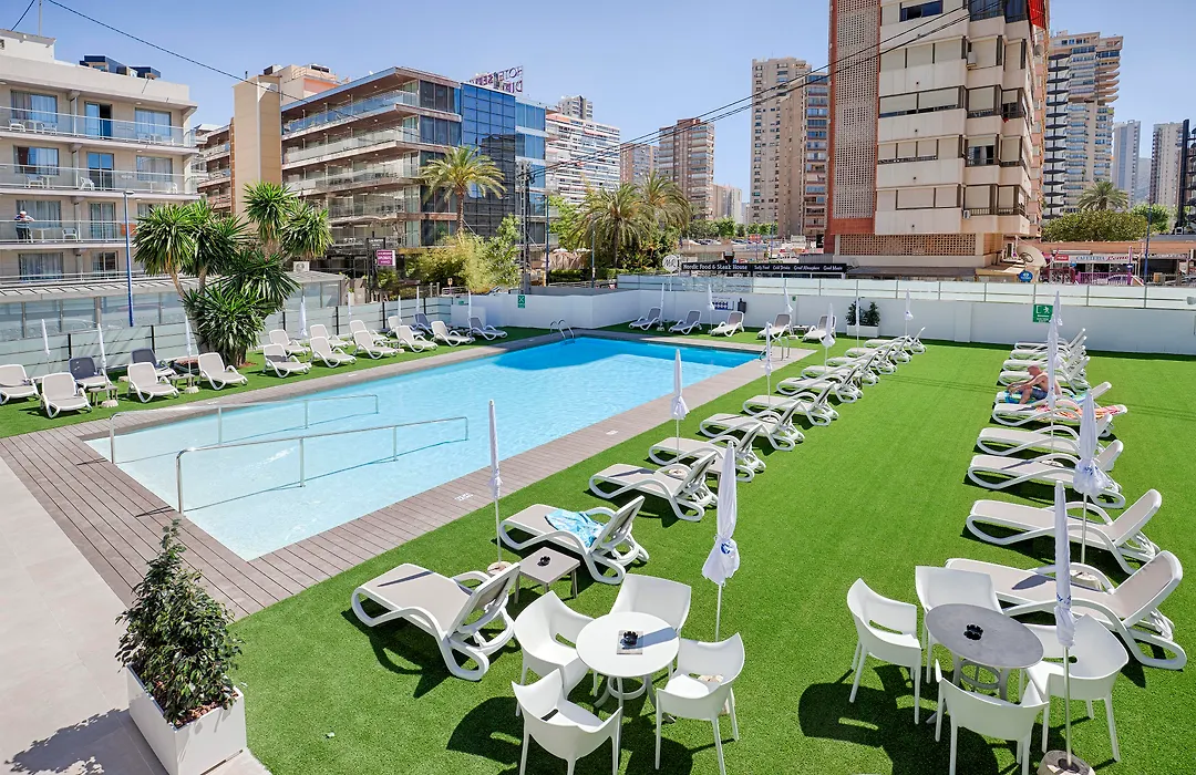Benidorm Centre - Adults Only (4-star) offers a central location with access to Levante Beach and an all-year-round outdoor swimming pool. Dining options include a buffet restaurant with show cooking, a café, and a snack bar. The hotel also features a range of services and entertainment tailored for adults.
