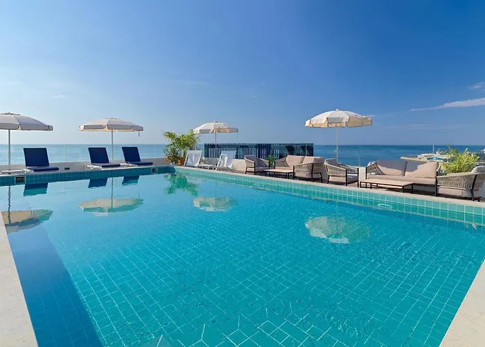 Dining options at the hotel include an elegant restaurant with views of the sea, serving Mediterranean and international cuisine. The hotel also features a rooftop bar with a plunge pool and a café offering snacks and beverages, including the popular Blue Truck for casual meals by the pool.