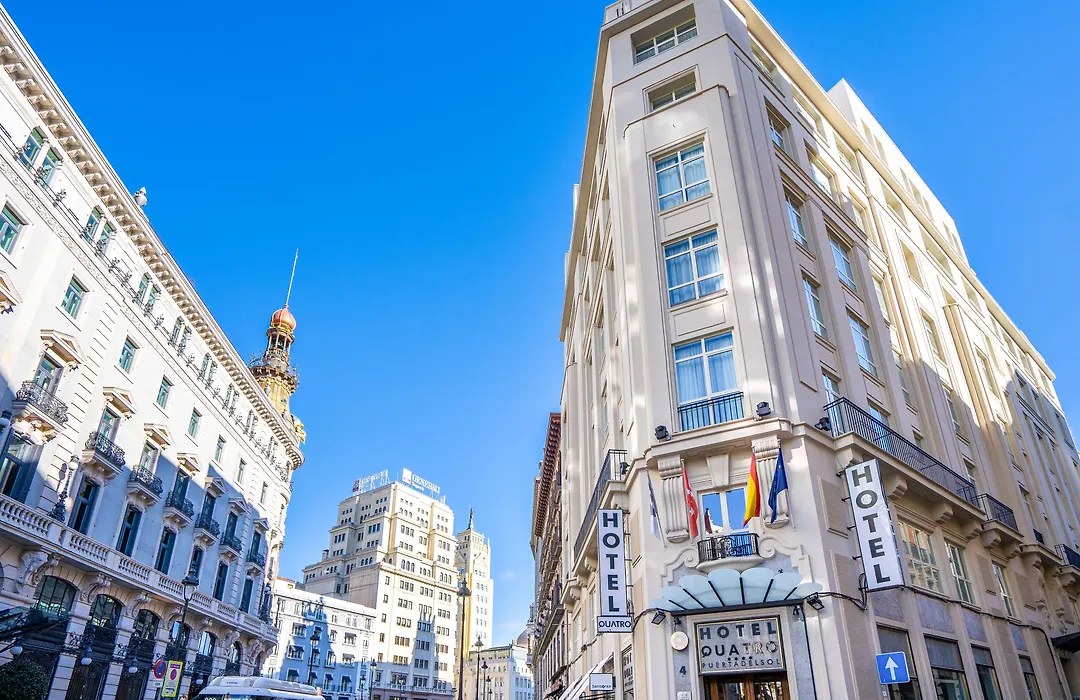 Quatro Puerta Del Sol is a 4-star Madrid hotel with a rating of 8.5/10 on Booking.com, situated close to famous landmarks and renowned shopping streets. It features amenities such as a 24-hour reception, free Wi-Fi, and an on-site buffet breakfast.