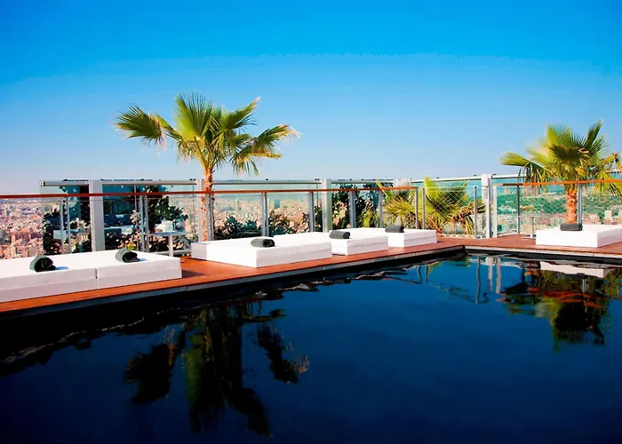Renaissance Barcelona Fira Hotel, a 4-star L'Hospitalet de Llobregat hotel with an 8.8/10 Booking.com rating, features two 27-story towers integrated with a lush vertical garden. It offers indoor and seasonal rooftop pools, a fitness center, and a panoramic Mediterranean restaurant.